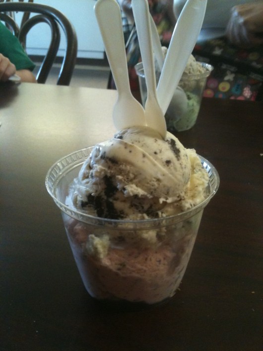 My cup at Fosselman’s: Cookies and Cream (my classic ice cream choice) and on bottom is the most awesome chocolate-dipped strawberry. These two together were a-ma-zing!