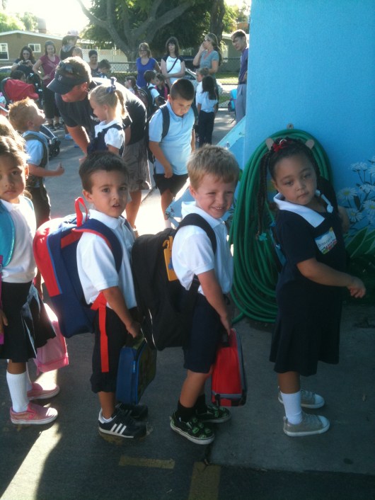As the photos showed Wednesday, public elementary (and in our case, a T-K through 8th grade) truly is a BIG pond, and we are but the teensiest, tiniest fish in it, mere plankton really. I say we because it’s not just that our T-K kids are physically the smallest ones out there (18 kids ages four and five of over 1100 students up through ages 14-15 on the entire campus – !) but because for those of us with an only or eldest child of the brood, it’s also our first time as parents of a kid in a public school. We, too, are going to school and are going to be schooled this year; we parents don’t yet know the social structures, the bureaucracies, and the whole of the school setting just yet, but we’re going to have opportunity after opportunity to learn them, know them, and live them as Brad Hamilton of Fast Times at Ridgemont High might have said. And, yes, we’ve had a peek inside to some of the inner-workings of the system already. Many parents are already complaining that the schedule isn’t firm (a letter went home on day one with K students about a potential change to the bell schedule in a few weeks, but stay tuned!) and that they’ve been asked to re-do some forms that we completed at the registration time last spring – and this is just day three! Wow, I wonder how MONTH three will be?!